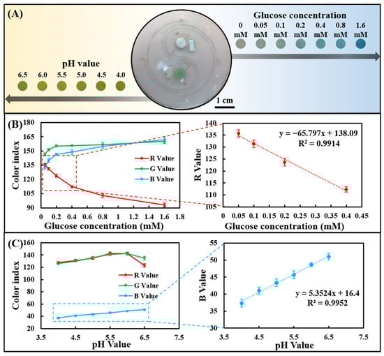 Determine the sweat glucose concentration and the pH value detection range in the chip using artificial sweat samples. (A) Optical images of the chip after reacting with artificial sweat samples. (B) RGB color index of the chip-based glucose assay and linear calibration curve for glucose in terms of the R-value. (C) RGB color index of the chip-based pH assay and linear calibration curve for pH in terms of the B value.