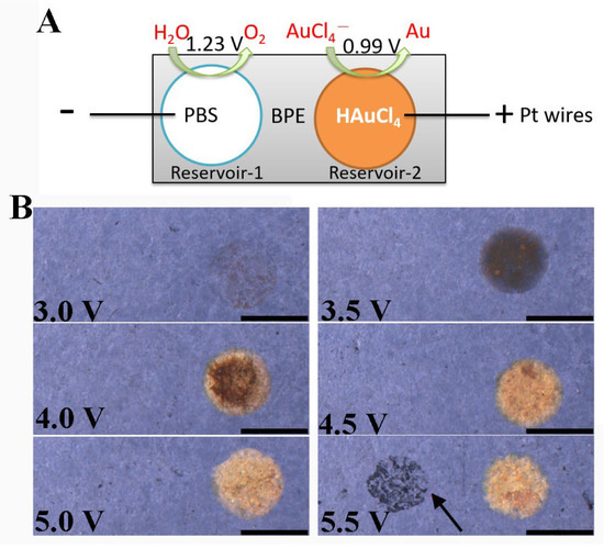 Bipolar electrodeposition of Au particles on one pole of the GP BPE. (A) Schematic representation of bipolar deposition of Au on one pole of GP BPE. (B) Optical images of Au film obtained under various external voltages from 3.0 to 5.5 V for 300 s. The concentration of HAuCl4 was 5 mM. The black arrow indicates the corrosion of GP in the right reservoir; the scale bar represents 3 mm.