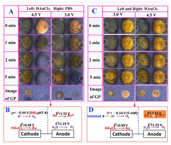 The above results showed that it is difficult to electrodeposit Au particles on both ends of the bipolar electrode. However, in the previous work, we successfully adopted a two-step bipolar electrodeposition method to electrodeposit gold and platinum on its two ends, using carbon spheres as the BPE [25]. Compared with the current method, an open system was used in previous work wherein both the anode and cathode of the BPE were immersed in the same solution for electrodeposition. In the current work, the end of the BPE that needed to be gold-plated was immersed in HAuCl4, and the anode of the BPE that did not need to be gold-plated was immersed in PBS. To understand whether the solution had an impact on the BPE’s electrochemical reactions, we replaced the PBS in the right reservoir (anode) with HAuCl4 during the second bipolar deposition process (Figure 2C). To our surprise, the Au film in the right reservoir showed no significant change, and bright yellow Au could be observed on the GP surface in the left reservoir (cathode) after 2 min. Even when a high voltage was applied (4.5 V) (Figure 2C, Video S2, ×10 frame rate), the Au film at the right reservoir (anode) still maintained its original color, and the Au deposition rate in the left reservoir (cathode) increased. By comparing the videos (Videos S1 and S2) and images (Figure 2A,C) captured at 4.5 V, it was found that a lower number of bubbles were produced on the cathodic BPE filled with HAuCl4 than those filled with PBS. This difference indicated that the reduction of protons at the cathode and the oxidation of Au at the BPE anode were greatly inhibited (Figure 2D) when PBS was replaced with HAuCl4. In this case, the fact that only water could be oxidized at the BPE anode suggested that the voltage at both the BPE poles was decreased insufficiently to drive the oxidation of Au at the anode. Furthermore, the amperometric i–t curve obtained from electrodes exposed to HAuCl4 was very stable after approximately 40 s (curve b in Figure S1), which was different from that obtained from the electrode exposed to PBS (curve a in Figure S1).