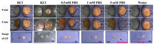 Different concentrations of PBS solutions were used to study the effect of solution conductivity on the electrochemical reaction on the bipolar electrodes (Table S1). The right reservoir was filled with water, 0.5 mM PBS, 1 mM PBS, and 5 mM PBS. The left reservoir was filled with a 5 mM HAuCl4 solution. As shown in Figure 3, Au was deposited on the left GP without any significant change from the right reservoir’s Au film when 0.5 and 1 mM PBS were used. However, the Au film in the right reservoir decomposed when the PBS concentration was increased to 5 mM. When the right reservoir was filled with ultrapure water, no obvious change was observed on the graphite paper electrodes at the left and right ends, suggesting that the electrochemical oxidation of gold did not occur at the BPE anode, and the reduction of HAuCl4 did not occur at the cathode. In summary, the electrochemical reactions on bipolar electrodes are mainly affected by the conductivity of the solution.