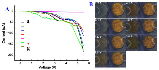(A) LSV curves recorded during the second-step deposition of Au. The currents were obtained by filling the right reservoir with different solutions: 10 mM PBS (a), 5 mM PBS (b), 1 mM PBS (c), 0.5 mM PBS (d), water (e), 5 mM HAuCl4 (f), and 5 mM HCl (g). The left reservoir was filled with 5 mM HAuCl4. (B) Optical images were recorded during the second deposition of Au under linear sweep voltage. Both reservoirs were filled with 5 mM HAuCl4. The applied voltage was changed from 0 to 5.5 V at a scan rate of 0.005 V/s.