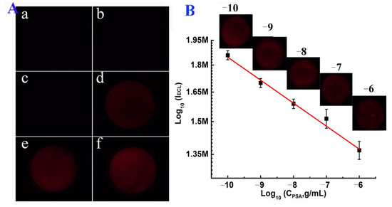 Figure 5B is the calibration curve of the prepared electrode for the detection of PSA at the anode of BPE. A good linear relationship was observed between the ECL intensity and the logarithmic PSA concentration from 1 × 10−10 to 1 × 10−6 g/mL, with a correlation coefficient of 0.9866. The linear equation is lg IECL = −0.0322 lgC (g/mL) + 5.944. The limit of detection (LOD) and quantification (LOQ) was calculated to be 1.5 × 10−11 and 1.0 × 10−10 g/mL based on 3 σ/s and 10 σ/s, respectively. Here, σ and s are the standard deviation of the blank signal and the slope of the calibration curve. Compared with other PSA biosensors based on imaging strategies [27,28,29,30], the ECL biosensor developed in this work displayed a wider linear range and a high sensitivity for imaging of PSA (Table S2).