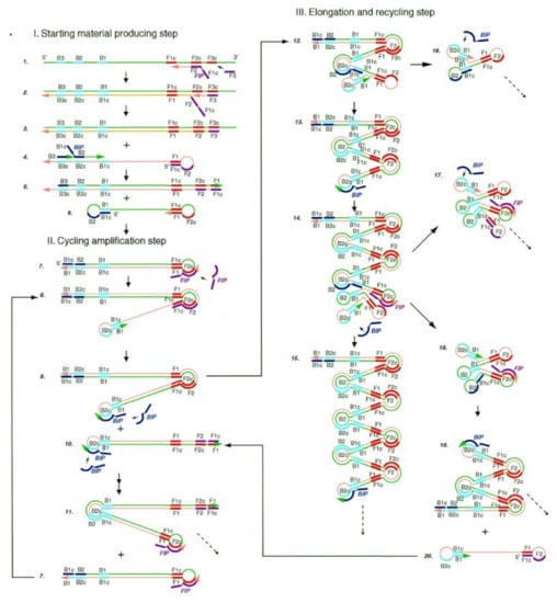 Steps in the LAMP mechanism. A pair of inner primers (BIP) with a folding structure and a pair of outer primers (FIP) for replacing single-strand products are required. Under the action of FIP, BIP and the Bst DNA polymerase with chain displacement activity, dumbbell intermediate products with a ring structure at both ends are generated. The amplification products of dsDNA concatemers were amplified by the double action of initiating extension in the ring region of the BIP recognition intermediate and self-initiating extension at the 3′ end of the folding structure. Reprinted with permission from Ref. []. Copyright 2018, Wong et al.