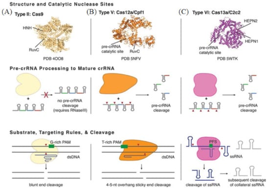 Basic structure and functions of Class 2 CRISPR-Cas Types. (A) The representative of Type II is Cas9 from Streptococcus pyogenes. (B) The representative of Type V is Cas12a from Francisella novicida U112. (C) The representative of Type VI is Cas13a from Leptotrichia shahii. Reprinted with permission from Ref. []. Copyright 2018, Pyzocha et al.