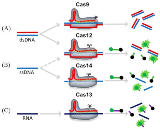 Schematic representations of different Cas enzyme activities. Reprinted with permission from Ref. []. Copyright 2020, Suea-Ngam et al. (A) Cas9: The target dsDNA is cis-cleavage after binding to the gRNA-Cas9 complex. (B) Cas12/14: The target ds/ssDNA binds to the gRNA-Cas12 complex and is cis-cleavage, followed by an ssDNA that is trans-cleavage and releases a fluorescence signal. (C) Cas13: The target RNA binds to the gRNA-Cas13 complex and is cis-cleavage, followed by an ssRNA that is trans-cleavage and releases a fluorescence signal.