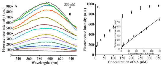 (A) Fluorescence emission spectra in the response to different concentrations of SA (0, 0.5, 5, 10, 30, 50, 80, 100, 150, 200, 250, 300, 350 nM) under optimal concentration. (B) Fluorescence intensity versus SA concentration at 600 nm and the linear relationship between fluorescence intensities and low concentrations of SA (inset); error bars were estimated from three replicate measurements.
