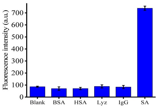We tested 150 nM of several proteins, such as BSA, HAS, IgG, Lyz and blank, by the proposed assay under the optimized concentrations to investigate the selectivity [38]. The fluorescence intensity of other protein samples, which is comparable to the blank one, is obviously different from the sample adding SA (in Figure 3). The reason is that there is a high specificity between SA and biotin, which can protect DNA from exonuclease degradation through the terminal protection interaction. Thus, only the group with SA has a high fluorescence signal. These results indicate that the proposed assay showed good selectivity for the quantitative determination of SA.