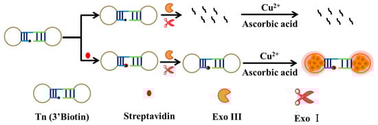 The key part of the fluorescent biosensor is the formation of the SA-biotin complex, which can prevent degradation of the DNA probe (Tn) by the Exo I and Exo III with its strong steric hindrance [33]. At first, a special 3′-biotin-modified DNA probe was designed, which contained two poly T loops after forming the hairpin structure. In the absence of SA, Tn can be easily degraded into mononucleotide by exonucleases (Exo III for the double-stranded stem and Exo I for the remaining single-stranded loop) [34]. Therefore, no CuNPs were formed, and fluorescence did not generate. Conversely, in the presence of SA, due to the terminal protection of the SA-biotin complex, Tn retained the intact hairpin structure after adding Exo III and Exo I. Tn could be used as a template for CuNPs’ formation after adding CuSO4 and Vc, generating a high fluorescence intensity [35,36]. Therefore, the SA concentrations can be easily identified from the fluorescence change in the solutions (Scheme 1).