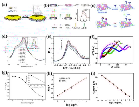(a) Electrochemical DNA sensing using MoS2, schematics representations for functionalization of MoS2; (b) Label-free electrochemical detection of miRNA-21 using Au NP decorated MoS2 NSs, schematic representations for working electrode modifications; (c) Ag NPs decorated MoS2/rGO hybrid NSs for electrochemical sensing of carcinoembryonic antigen schematic representation; (d) electrochemical sensing response at different concentrations of DNA; (e) electrochemical response at different concentrations of miRNA-21 in the electrochemical cell; (f) Nyquist plots; (g) calibration curve for DNA detection; (h) miRNA-21 calibration curve; (i) calibration curve for CEA detection. (a,d,g) reprinted with permission from ref. [146], Copyrights 2014 American Chemical Society. (b,e,h) reprinted with permission from ref. [61], Copyrights 2017 American Chemical Society. (c,f,i) reprinted with permission from ref. [140], Copyright 2018 Elsevier.