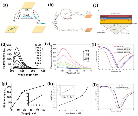 (a) DNA sensing using high fluorescence quenching properties of single-layer MoS2 NSs, Schematic representation; (b) Detection of miRNA using fluorescence quenching properties of WS2 NSs, Schematic of working principle; (c) Surface plasmon resonance-based DNA detector using graphene/WS2 hybrid structure, sensing platform schematic; (d) fluorescence intensity variation with DNA concentration; (e) response at different concentrations of miRNA; (f) response with targeted DNA; (g) Calibration curve for DNA sensing; (h) Calibration curve for miRNA detection; (i) response with non-targeted DNA. (a,d,g) reprinted with permission from ref. [66]. Copyrights 2013 American Chemical Society. (b,e,h) reprinted with permission from ref. [164]. Copyrights 2014 American Chemical Society. (c,f,i) reprinted with permission from ref. [171]. Copyright 2018 Elsevier.