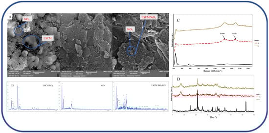 Raman spectroscopy was used to determine the structural changes of the prepared samples (LSCMO-S, GO, and LSCMO-S/G; Figure 3C). At GO, two strong peaks are seen at 1354 cm−1 (referenced to the D mode), indicating the presence of sp3 defects, and 1621 cm−1 (referenced to the G mode), associated with all sp2 carbon forms [59]. The vibrational mode of the perovskite material (ABO3) is active in the 200 cm−1 region [60]. The characteristic vibrational band of SiO2, centered around 143 cm−1, can also be observed in LSCMO-S [61]. Compared to the pure LSCMO-S, the intensity of the peaks of the LSCMO-S hybrid GO has slightly decreased, and some of the main peaks corresponding to LSCMO-S have disappeared due to the high content of GO in the hybrid sample.