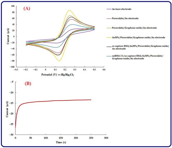 (A) CV voltammograms of Au bare electrode, Au modified electrode by Perovskite, Au modified electrode by Perovskite/graphene oxide, Au modified electrode by Perovskite/graphene oxide/AuNPs/ss-capture RNA, and Perovskite/graphene oxide/AuNPs/ss-capture RNA/miRNA-21 in [Fe(CN)6]3−/4− as a redox probe. Also, the scan rate is 50 mV s−1, and the potential range is −0.2 to +0.5 V, (B) Au electrode Chronoamprogram in the solution including 20 mL of 0.01 M HAuCl4 for immobilizing of AuNPs at E = 0 V for 500 s.