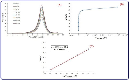 (A) DPVs (Equilibration time = 0, E initial = −0.2 V, Estep = 0.1 V, E end = 0.5 V, Amplitude = 0.01995 V, frequency = 10 Hz) of the fabricated genosensor in various concentrations of miRNA-21 include: (10−14–10−7 M). Supporting electrolyte is [Fe(CN)6]3−/4−, [Fe(CN)6]3−/4− is applied as a redox probe, ss-capture RNA concentration is 1 µM, (B) Dependency of peak currents different concentrations (Calibration plot), (C) Plot of Ln C (concentrations).