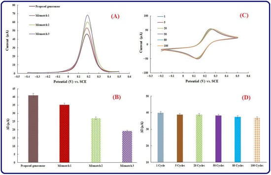 (A) Selectivity of the fabricated genosensor: DPVs of the engineered genosensor in hybridization by miRNA-21, 1-mismatch miRNA-21, 2-mismatch, and 3-mismatch miRNA-21. The scan rate is 50 mV s−1. (B) Histograms of the proposed genosensing assay selectivity, (C) CVs of modified Au electrode in different cycle numbers. (D) Histogram associated with different cycle numbers.