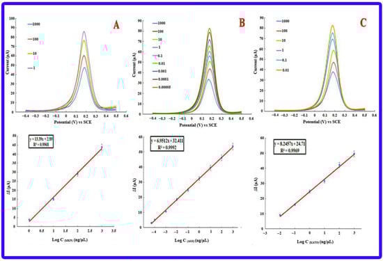 Electrochemical results of detecting different concentrations of miRNA-21 in cell lines (A) MKN-45 with a detection limit of 1 ng/µL, (B) AGS with a detection limit of 5 × 10−5 ng/µL and (C) KATO III with a detection limit of 0.01 ng/µL.