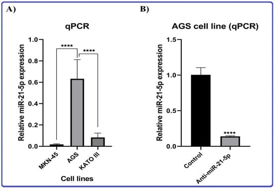 (A) Relative miRNA-21 expression in MKN-45, AGS, and KATO III cell lines by qRT-PCR. (B) Relative miRNA-21 expression in AGS cell line treated with Anti-miR-21 and control cell line by qRT-PCR. **** indicates p value < 0.0001.