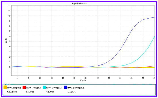 To compare the detection ability of the qRT-PCR technique with the designed electrochemical biosensor, different concentrations of extracted RNA from AGS cell lines and cDNAs, which were synthesized for the qRT-PCR technique, were prepared. Subsequently, the investigation process of the proposed genosensing assay has been performed. Based on the results, there was not enough synthesis signal in the qRT-PCR technique for concentrations less than 100 ng/μL (Figure 10). At the same time, the electrochemical biosensor detected up to 5 × 10−5 ng/μL concentration (Figure 9A).
