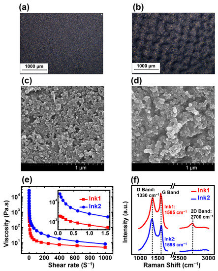 Optical microscope image of (a) Ink1 and (b) Ink2 over a glass substrate. SEM images of (c) Ink1 and (d) Ink2 over a glass substrate (e) viscosity data of Ink1 and Ink2 for the shear rate range of approx. 0–1000 S−1. The inset figure shows the viscosity data for the shear rate range of approx. 0–1.5 S−1 (f) Raman spectra of Ink1 and Ink2 showing the material composition of both inks. The D, G and 2D bands were explored to understand the presence of graphene layers.