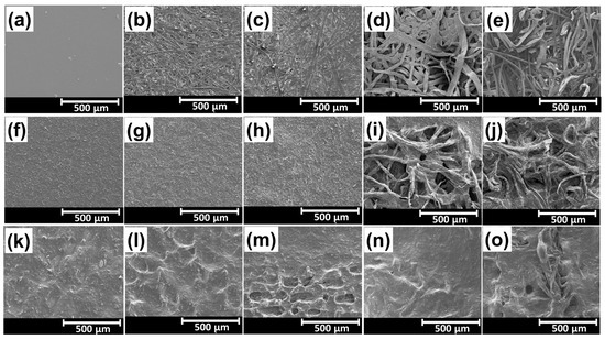 The SEM images of Ink2 coated substrates are presented in Figure 3k–o. The hill-valley-shaped rough surface was obtained for CS and S1, as shown in Figure 4k,l, owing to the higher intrinsic roughness value of Ink2. The roughness of Ink2 film over S1 was higher compared to CS, owing to the fibrous structure of S2. Figure 3m shows that the film formed over the wavier part of the S2 had a much rougher surface texture compared to the film formed over the flatter parts. Meanwhile, Figure 3n,o demonstrate that Ink2 completely covered the highly fibrous and porous structure of the lab tissue paper (S3) and paper towel (S4). Ink2 barely mimicked the surface characteristics of substrates, owing to the higher viscosity. However, the texture of substrates still played an important role, i.e., the Ink2 film became rougher for uneven surfaces. Meanwhile, it is evident that the fibrous structure of S3 and S4 substrates coated with Ink1 and Ink2 resembled the randomly distributed spinosum layer between the dermis and epidermis layer, which could lead to a better sensing characteristic. The intrinsic surface properties of substrates will have an impact on the device characteristics since the substrates’ morphology directly impacts the sensing layer’s properties.