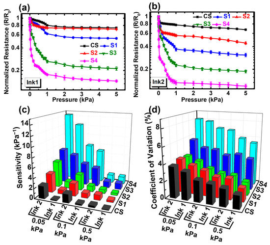 Electrical characterization data of paper-based tactile sensors. Normalized resistance (R/R0) changes with applied pressure for sensors with (a) Ink1 and (b) Ink2. The sensitivity and coefficient of variation data are also presented in (c) and (d), respectively.