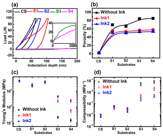 Two different types of cellulose fiber substrates, which have low and high porosity/compressibility, are shown in Figure 6. The substrates with low porosity and compressibility (CS, S1 and S2) generate relatively fewer electrical contact points at the interfaces compared to the substrates with high porosity and compressibility (S3 and S4). The physical properties of the substrates were confirmed by nanoindentation, pycnometry and a tensile stress-strain experiment. Figure 7a shows the nanoindentation data of our cellulose fiber substrates (S1–S4), along with the PET substrate as the control sample (CS). The load by the Berkovich 142.3° diamond probe over the substrate material was plotted as a function of the indentation depth. For CS, the exerted load reached the maximum value of 98 µN at the indentation depth of 63.4 nm. Meanwhile, the recorded indentation depth of S1 and S2 were 103.2 nm and 75.1 nm, respectively, for 98 µN applied load. However, for lab tissue paper substrate (S3) and paper towel (S4), the indentation depth can surpass 2500 nm and the recorded loads were 35.7 µN and 27.1 µN at 2850 nm indentation depth. There was no typical unloading curve for S3 and S4, showing both to have higher displacement under low pressure, which could be related to the higher porosity of the substrates.
