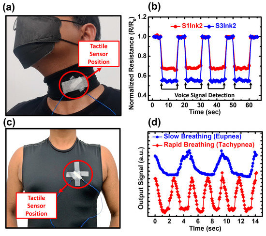 The sensors were further investigated by performing the detection of breathing patterns. The tactile sensor with an S3 substrate coated with Ink2 was used to distinguish two respiratory patterns, i.e., eupnea (slow/normal breathing) and tachypnea (rapid breathing). The tactile sensor was attached to the chest of a volunteer, as shown in Figure 8c; the variations of the electrical signals were monitored according to the inhalation and exhalation of the volunteer.
