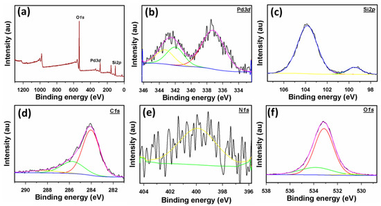 (a) Survey XPS spectrum of Pd@PSi−PPy−C nanocomposite. (b) Fine scan XPS spectrum of Pd-3d, (c) Si-2p, (d) C-1s, (e) N-1s, and (f) O-1s orbitals of Pd@PSi−PPy−C nanocomposite.