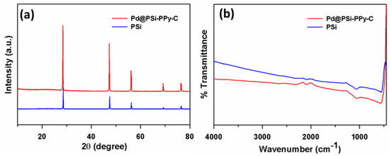 In the XRD patterns (Figure 2a), the diffraction bands that appeared at 2θ = 28.3°, 47.3°, 56.0°, 69.1°, and 76.3° were related to (2 2 0), (3 1 1), (4 0 0), (3 3 1), and (4 2 2) lattice planes for Si (JCPDS # 27-1402), respectively [44]. The carbon-related peak of carbon black present in the Pd@PSi–PPy–C often appeared at 2θ = 24.3°, which was correlated to (0 0 2) plane [21], which is not properly visible in Figure 2a due to its sluggish intensity. Because of the low palladium content (1%) in Pd@PSi–PPy–C, the PdNPs peaks were not visible in the XRD patterns; however, the presence of PdNPs in the Pd@PSi–PPy–C was confirmed by XPS, EDS, SEM, and TEM. Figure 2b displays the FTIR investigation results of the Pd@PSi–PPy–C nanocomposite. Characteristic PSi NPs’ vibrational bands appearing at 2287 and 2095 cm−1 could be correlated to Si–H2 and Si–H stretching modes of vibration, respectively [45]. Distinct FTIR peaks that appeared at 1075 and 559 cm−1 were attributed to asymmetric Si–O stretching modes of vibrations [46,47].