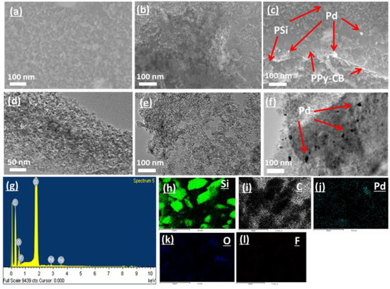 Morphological and elemental analyses: FESEM image from (a) PSi, (b) PSi−PPy−C, (c) Pd@PSi−PPy−C; TEM micrograph from (d) PSi, (e) PSi−PPy−C, (f) Pd@PSi−PPy−C; (g) EDS spectrum of Pd@PSi−PPy−C; (h–l) elemental mapping of Pd@PSi−PPy−C nanocomposite.