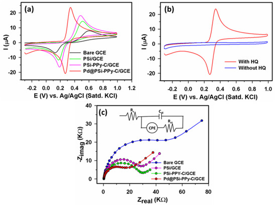We explored the electrochemical activities of fabricated electrodes by cyclic voltammetry (CV) and electrochemical impedance spectroscopy (EIS). Figure 4a displays a weak CV output resulting from the bare GCE with 350 µM HQ at +0.61 V. PSi/GCE and PSi−PPy−C/GCE electrodes produced an improved CV response in the presence of 350 µM HQ at +0.52 V and +0.49 V, respectively vs. Ag/AgCl; however, the significantly improved CV result at +0.34 V was attained for Pd@PSi−PPy−C/GCE. Therefore, it was confirmed that the Pd@PSi−PPy−C/GCE electrode showed the best electrocatalytic activities during the HQ detection compared to other electrodes specified in Figure 4a. Hence, we nominated the Pd@PSi−PPy−C/GCE electrode as the HQ sensor in this work. Additionally, for the Pd@PSi−PPy−C/GCE electrode, a distinctive CV peak was achieved with 350 µM HQ, but, in the absence of HQ, no response was observed (Figure 4b) that further established the effective electrochemical properties of the Pd@PSi−PPy−C/GCE HQ sensor. Figure 4c shows the EIS Nyquist plots for the bare GCE, PSi/GCE, PSi−PPy−C/GCE, and Pd@PSi−PPy−C/GCE and the corresponding equivalent circuit is given in the inset. A low semicircular diameter obtained for the Pd@PSi−PPy−C/GCE suggested a lowered Rct value (32 kΩ) of this electrode compared to the bare GCE (78 kΩ), PSi/GCE (47 kΩ), and PSi−PPy−C/GCE (39 kΩ) [48,49]. Therefore, we conclude that the Pd@PSi−PPy−C/GCE electrode exhibited enhanced electron transfer capability in comparison to other electrodes examined in Figure 4c.