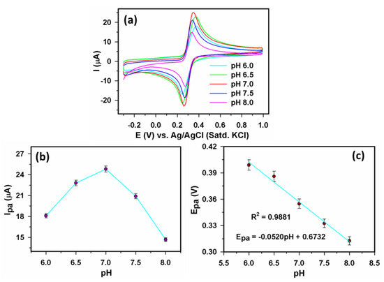 To explore the electrochemical oxidation of HQ, we studied the pH effect in the range of 6.0–8.0 in the presence of 350 µM HQ. Figure 5a,b show that the Ipa value gradually increased for pH 6.0–7.0, whereas a decreasing trend for pH 7.0–8.0 was detected, and thus the optimal Ipa was observed at pH ~ 7.0 in Figure 5b. Consequently, pH 7.0 was fixed for the rest of the experiments in this work. Figure 5c displays a straight line plot of Epa vs. pH having the regression Equation (1).