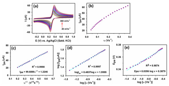 Furthermore, in Figure 6e, another linear plot of Epa vs. log(υ) was achieved with the following Equation (4).