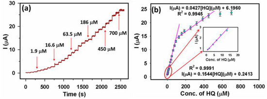 We used the amperometric technique to explore the sensor performance of the Pd@PSi–PPy–C/GCE sensor. The amperometric (i–t) response was acquired at the optimized potential of +0.35 V with successive HQ additions with varying concentrations (1–700 µM). Figure 7a displays the amperometric i-t curve accomplished with HQ using the Pd@PSi−PPy−C/GCE assembly. Here, for each HQ addition, the current response reached ~96% of its highest current in only 6 s. Figure 7b displays two linear segments in the calibration plot: for the lower concentration region, 1–13 µM HQ, and for the higher concentration part, 13–450 µM HQ plotted based on the amperometric responses having the following Equations (5) and (6), respectively.