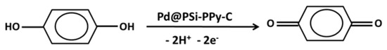 Herein, during the HQ detection, the electrochemical response progressively increased with the increasing HQ concentrations. Thus, HQ became oxidized at the Pd@PSi−PPy−C/GCE sensor surface by losing two electrons to the conduction band of the Pd@PSi−PPy−C nanocomposite that originated the electrochemical response [1]. Therefore, the overall senor activity of the Pd@PSi−PPy−C/GCE can be presented as in Scheme 2.
