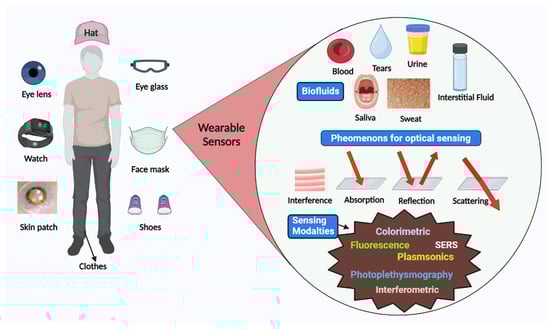 Figure 2. Schematic representation of various available wearable optical sensors, sensing mechanism, and biofluids for detection.
