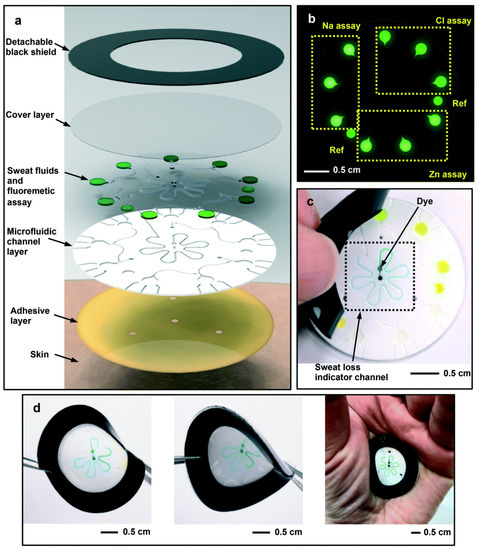 48. Choi, J.; Bandodkar, A.J.; Reeder, J.T.; Ray, T.R.; Turnquist, A.; Kim, S.B.; Nyberg, N.; Hourlier-Fargette, A.; Model, J.B.; Aranyosi, A.J.; et al. Soft, Skin-Integrated Multifunctional Microfluidic Systems for Accurate Colorimetric Analysis of Sweat Biomarkers and Temperature. ACS Sens. 2019, 4, 379–388. [Google Scholar] [CrossRef]