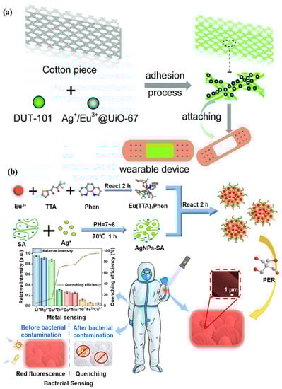 Figure 5. Illustration of (a) a metal–organic framework-based wearable sweat monitoring fluorescent device. Reprinted with permission from Journal of Materials Chemistry C, Copyright 2018, Royal Society of Chemistry [55]; (b) a fluorescent sensor for detecting Escherichia coli and Staphylococcus aureus pathogenic bacteria. Reprinted with permission from ACS Applied Nano Materials, Copyright 2012, American Chemical Society [29].
