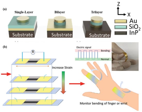 Figure 6. Schematic of the (a) flexible MIM-disk-based LSPR cancer sensor. Reprinted with permission from Scientific reports, Copyright 2018, Nature Publishing Group [59]; (b) graphene oxide and AuNPs based wearable LSPR strain sensor, Reprinted with permission from Advanced Materials Technologies, Copyright 2021, Wiley [60].