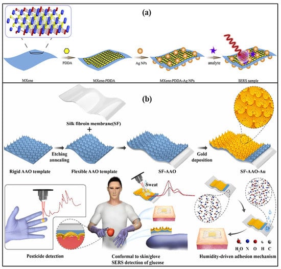 The cationic polymer poly (diallyl dimethyl ammonium chloride) was used to change the nature of the MXene surface, as functional groups in MXene and AgNPs coated with citrate are negatively charged in nature. It provides a detection limit of 100 µM [80]. A SERS-based wearable sensor that consists of Au nanoparticles, silk fibroin, and aluminum oxide that can be attached to gloves with the help of glue was demonstrated for sweat glucose detection. In the sensor structure, silk fibroin, an aluminum oxide cavity, and AuNPs are used, which act as a flexible support template and help in the generation of plasmons, as shown in Figure 9b. It can measure the glucose concentration in the range of 100–10,000 μM with a detection limit of 100 μM. This lab-on-glove sensor was also used to explore the Thiram bactericide, which causes several diseases related to the skin, liver, and eye [81].