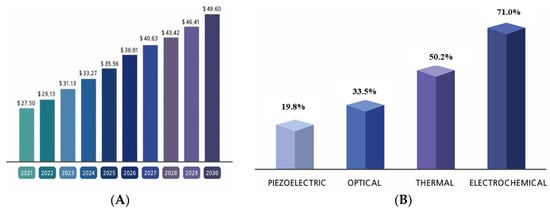 The global biosensor market is rapidly growing owing to emerging diseases, and the adoption of innovative technologies, such as artificial intelligence and the internet of things, is common in the era of the fourth industrial revolution [1]. Biosensors are widely used to detect and monitor biomolecules in various industries, and this usage has grown rapidly, particularly in the era of COVID19, as biosensors are mainly used to detect coronavirus in patients. Chip-based biosensors are mainly utilized to detect virus spread among people. As shown in Figure 1A, the market for biosensors as of 2021 was 27.50 billion USD and is expected to expand to 49.60 billion USD by 2030. Biosensors can be categorized as piezoelectric, optical, thermal, and electrochemical depending on the sensor signal utilized; among these, 71% are electrochemical biosensors (Figure 1B).