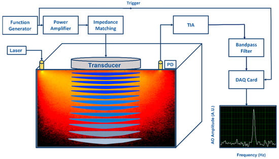 An illustration of an acousto−optic detection system: Acoustic part: Function generator generates amplitude modulated signal at fixed frequency (kHz) and power amplifier drives the ultrasonic transducer. Acoustic waves generated by the transducer propagate into the substance causing pressure changes in the substance. Optical part: Light illuminated by a laser propagates into the substance and a part of the diffused photons pass through the ultrasonic modulated areas causing light modulation to these photons due to the acousto−optic effect. A photo detector (PD) converts optical power to photocurrent (both DC and AC) and the transimpedance amplifier (TIA) converts it to voltage. When voltage signal is effectively filtered by a narrow bandpass filter at the fixed frequency, modulated light can be distinguished visible as a narrow power peak in frequency domain.