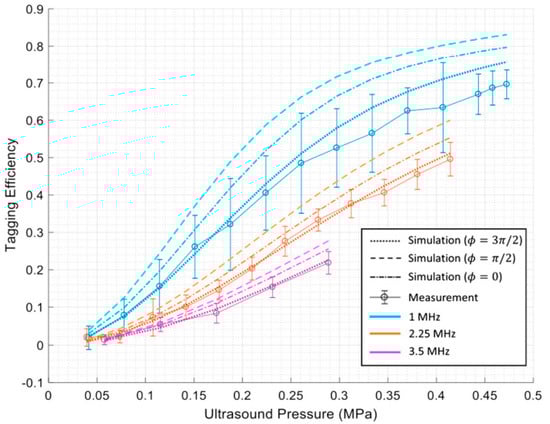 Huang et al. [17] have conducted MC simulation studies to gain a deeper understanding of the interaction between US and light and the quantification of tagging efficiency. They used the MC method to simulate the interaction between the two coherent modulation mechanisms to determine overall tagging efficiency. They showed that by considering the higher orders of modulation in the measurements, a higher degree of tagging efficiency could be achieved. They proposed a theoretical approach for obtaining tagging efficiency as the power of all frequency−shifted light over the power of light passing through the US region, which is more a robust and appropriate method. This knowledge is essential for estimating a system’s signal−to−noise ratio (SNR) and for improving detection methods to enhance SNR in US−assisted optical imaging techniques. They showed that the two US modulation mechanisms, particle displacement and refractive index change, counteract each other in scattering media. In addition, they quantified tagging efficiency versus US pressure and frequency via simulations and experiments. Their results indicate that tagging efficiency increases as US pressure increases. In contrast, a higher US frequency leads to lower amounts of tagging efficiency [17]. Figure 2 shows their results.