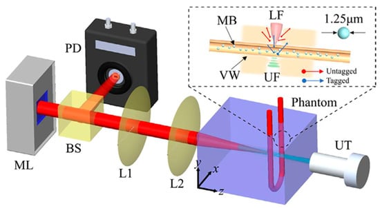 Illustration of the laser feedback AO Tomography system including microchip laser (ML), beam splitter (BS), PD, lenses (L1, L2,), and US transducer (UT), for imaging microbubbles (MB) inside vessel wall (VW). A reflective and autocollimation configuration is used for the whole system. The ML is pumped by laser diodes, which modulate the output power by reflecting backscattered photons. Light reflected from the BS reaches the PD and incident light reaches the front surface of the phantom. UT is placed coaxially with the laser beam, where the US focus (UF) overlaps the laser focus (LF). A function generator produces sinusoidal bursts at a repetition rate of 100 Hz, and is then amplified. Light and US are focused in the tube simultaneously. During UT operation, measuring light is shifted (3 MHz), whereas background signal is not shifted. Reprinted from [75], Copyright (2022), with permission from Elsevier.