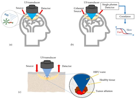 Most potential medical applications of AO techniques, (a) Monitoring high intensity focused US (HIFU) effects in transcranial applications, (b) Enhancement of the optics based cerebral blood flow and oxygenation measurements, (c) Tumor detection and its ablation monitoring.