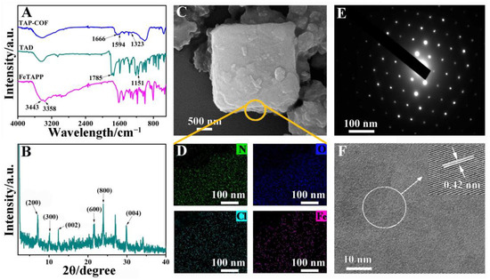 (A) FT-IR spectra of FeTAPP, TAD, and TAP-COF; (B) XRD spectra of the TAP-COF; (C) SEM image; (D) N, O, Cl, Fe element mapping; (E) SAED pattern from the crystalline domain; (F) HRTEM image of TAP-COF.
