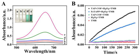 The absorbance changes of TMB, H2O2 + TMB, TAP-COF + TMB, FeTAPP + H2O2 + TMB, and TAP-COF + H2O2 + TMB are illustrated in (A) UV–vis spectra and (B) the impact of time on these changes. TMB reaction mixture’s color variations are seen in the inset.