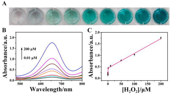 Small molecule biomarkers are a significant part of sustaining life processes and biological metabolism [1]. Among them, hydrogen peroxide (H2O2), one of the frequent reactive oxygen species in biological systems, is essential for promoting cellular proliferation, differentiation, and emigration [2,3]. Various illnesses including cancer [4], diabetes mellitus [5], neurological disorders [6], and angiocardiopathy [7] are tightly accompanied by abnormal H2O2 production. For example, cancer cells have considerably greater amounts of H2O2 (6.0 μM–1.2 mM) than normal cells (less than 0.72 μM) [8]. Therefore, the need for a reliable and accurate approach for the extremely hypersensitive identification of H2O2 in living creatures is critical. The examination of H2O2 has been reported using a variety of strategies, including electrochemical [9], fluorescence [10,11], electrochemiluminescence [12], spectrophotometry [13], etc., among which colorimetric tests [14] are considered to be an effective and straightforward method due to its affordability and usefulness.