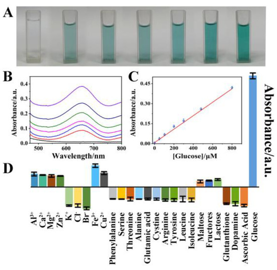 (A) A picture of the reaction mixture with various concentrations of glucose present. (B) The UV–vis absorption spectra. (C) Linear calibration of glucose detection. (D) The absorption of TMB-TAP-COF for different substances. (The concentration of potentially interfering substances was 50 μM, and the concentration of glucose was 0.5 μM, TMB was 0.8 mM and TAP-COF was 1.0 mg·mL−1).
