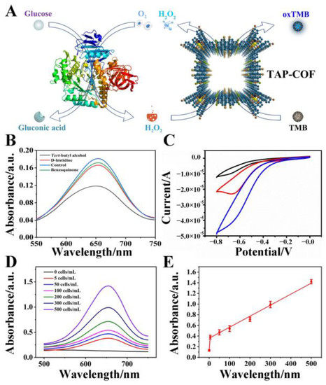 The cascade reaction-based colorimetric glucose assay is depicted in Figure 5A. The peroxidase-like activity of TAP-COF was derived from its catalytic H2O2 decomposition to produce ROS, mainly including singlet oxygen (1O2), hydroxyl radical (·OH), and superoxide anion (O2•−), where ·OH was a possible source of the catalytic process of TMB [36,37]. Next, capture experiments were used to test the ROS, and the catalytic mechanism and specificity of TAP-COF was further studied. As demonstrated in Figure 5B, the TMB + H2O2 + TAP-COF system showed different absorbance intensity with or without the addition of D-histidine (1O2 scavenger), tert-butyl alcohol (·OH scavenger), and benzoquinone (O2•− scavenger). The absorbance significantly decreased after the addition of tert-butyl, suggesting that the generated ·OH was scavenged by tert-butyl alcohol. Meanwhile, the system’s absorbance value exhibited no evident change after the addition of D-histidine and benzoquinone, indicating the specificity of TAP-COF peroxide-mimicking enzymes [38]. In summary, the peroxide-mimicking enzyme activity of TAP-COF mostly resulted from the ·OH, which was at odds with earlier studies on certain inorganic nanomaterials that were thought to originate via electron transport [39]. The electrocatalytic behavior of the TAP-COF and the FeTAPP modified GCE towards the electrochemical reduction of H2O2 was examined in further detail utilizing amperometric responses. Compared with the FeTAPP-modified electrode, the TAP-COF-modified electrode exhibited an enhanced reduction peak current, suggesting that TAP-COF exhibited higher electrocatalytic activity in the reduction of H2O2, which indicated that the TAP-COF had the better ability to accelerate the electron transfer (Figure 5C). Based on the above discussion, the possible explanation of TMB substrate oxidation by the TAP-COF catalyst in the presence of H2O2 might be proposed as follows: first, H2O2 entered the pores of TAP-COF or attached to the surface, and then the O–O bond of H2O2 broke to form ·OH. Second, ·OH oxidized TMB to produce a blue-colored byproduct. These phenomena indicated that the blue signal came from the charge transfer complex (chromogen). Electrochemical studies have indicated that there was a high degree of communication between the donor and acceptor of TAP-COF and the entire molecule’s electrical activity was governed by this connection. Moreover, the catalytic oxidation of TMB by H2O2 was aided by the D-A ordered structure of TAP-COF’s capacity to speed electron transport. Therefore, the design of TAP-COF with D-A properties was of great significance for the construction of novel colorimetric sensors.