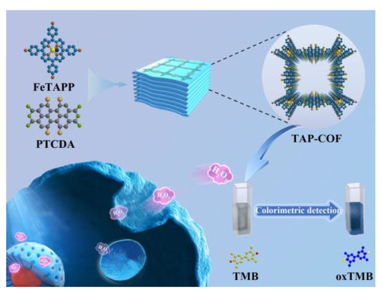 Porphyrin-based nanozymes are currently receiving more focus for their biological similarity to inartificial enzymes like cytochrome P450 and hemoglobin [17]. Various iron porphyrins, including hemin [18] and 5,10,15,20-tetrakis-(4′-bromophenyl)porphyrinato iron(III) [19] are used to simulate HRP activity. Free iron porphyrins cannot, however, be used in standard immunoassay platforms because of their poorer imitation of peroxidase activity and facile aggregation property [20]. Recently, a lot of interest has been focused on porphyrin-based covalent organic frameworks (COFs), which are produced from porphyrin or metalloporphyrin through strong covalent bonding, as biomimetic catalysts, electrocatalysts, and photocatalysts [21,22,23] due to their superior catalytic operations and close biological affinity to inartificial enzymes. These possess COFs’ intrinsic benefits, including their high surface area, tunable pore topologies, functionalization, and excellent thermal and chemical durability. By incorporating metalloporphyrin into COFs, high density active sites would be added to the skeleton of the COFs, and the catalytic deactivation brought on by porphyrin aggregation might also be prevented. Typically, Song’s group proposed a series of ultrastable iron porphyrin-based COFs with 3D channels as biomimetic catalysts [24]. Lin’s group created a 3D porphyrin-based COFs through the co-condensation of tetrahedrons with parallelogram construction blocks to enhance catalytic performance [25]. Additionally, to produce small band gaps for the dissociation and transportation of electron-hole pairs, the appropriate combination and arrangement of complementary donor–acceptor pairs inside the COFs skeleton have been shown to be an effective strategy to generate higher catalytic activity. Meanwhile, the unitarity of the COFs would be advantageous to boost the efficiency of enzymatic processes by improving the stable enzymes and decreasing the diffusion barrier.